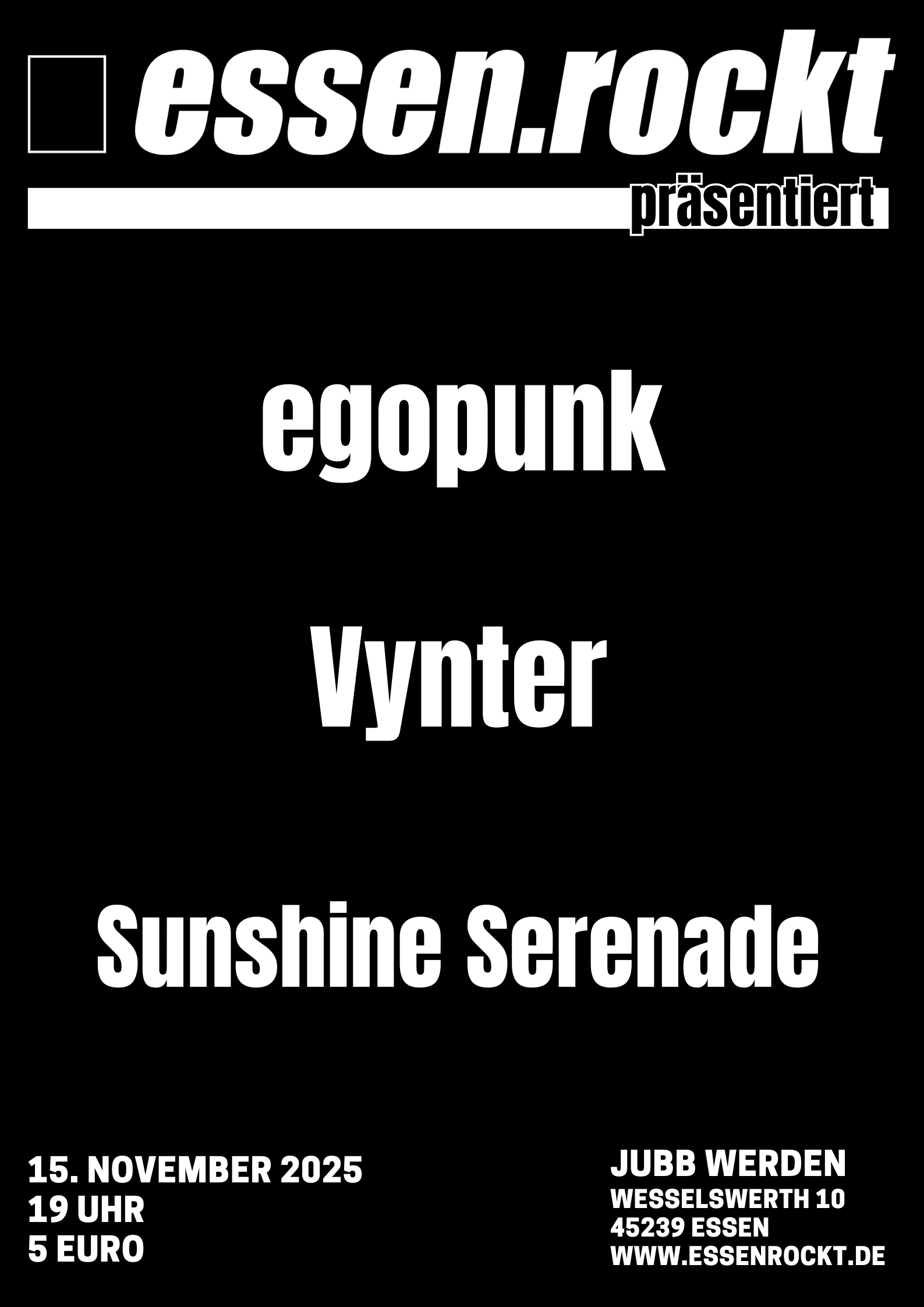 »15.11.2025 essen.rockt präsentiert in Werden Wir spielen wie jedes Jahr wieder im schönen Werden! Ab 19 Uhr gehts rund! Mit dabei sind Vynter und Sunshine Serenade. Eintritt 5 Euro! Erscheinen Sie, sonst weinen Sie! Hier gehts zum Flyer! »14.03.2026 Punkrock im EMO Wir spielen im EMO in RÜttenscheid. Mit dabei sind the Daily Grind und noch eine weitere Band. Weitere Infos bald! »07.03.2025 Tanztee mit Schuss im Julius Leber Haus Wir spielen wieder im schönen Julius Leber Haus. Ab 19:30 Uhr gehts rund! Mit dabei sind Vynter, Aalgorhythmus und Phantom. Eintritt 8 Euro (für Schüler:innen 4 Euro)! Erscheinen Sie, sonst weinen Sie! Hier gehts zum Flyer! »28.09.2024 essen.rockt präsentiert in Werden Wir spielen wieder im schönen Werden und feiern 20 Jahre egopunk und den Release unseres neuen Albums! Ab 19 Uhr gehts rund! Mit dabei sind Deine Eltern (25 jähriges Jubiläum + Album Release) und a solas sin mi (20 jähriges Jubiläum). Eintritt 5 Euro! Erscheinen Sie, sonst weinen Sie! Hier gehts zum Flyer! »18.05.2024 Unplugged Wir spielen in Byfang auf einer privaten Party ein kleines Unplugged-Set. »15.03.2024 Tanztee mit Schuss Wir spielen im Julius Leber Haus und mit dabei sind Aalgorhythmus, Club Scum und No Love Lost. Los geht es um 19:30h, Eintritt 8 Euro (Schüler*innen 4 Euro)! Erscheinen Sie, sonst weinen Sie! Hier gehts zum Flyer! »21.10.2023 essen.rockt presents in Werden Wir spielen wieder im schönen Werden! Ab 19 Uhr gehts rund! Mit dabei sind Missing Tuesday und Phantom. Eintritt 5 Euro! Erscheinen Sie, sonst weinen Sie! Hier gehts zum Flyer! »05.05.2023 Akustik-Konzert Ein kleines Akustik-Konzert auf einer privaten Geburtstagsparty. »25.02.2023 Proberaumkonzert Wir wurden zum gemütlichen Proberaumkonzert eingeladen. Mit dabei waren Stefan Flanders und Van Buren Street. »12.08.2022 Record Release Show in Werden Wir veröffentlichen unser erstes Band-Album "alte Geschichten"! Jede:r Besucher:in bekommt das Album gratis! Als Support mit dabei sind Zeitkonsum aus Oberhausen. Für läppische 5€ gehts um 20h los im JuBB Werden, Wesselswerth 10, 45239 Essen. Hier gibts n Flyer! »05.12.2020 Garden Of Arts ABGESAGT! Wir spielen beim diesjährigen "Garden Of Arts" Festival in Essen-Frohnhausen. Nähere Infos bald! »05.12.2014 ausgestöpselt-Sampler Präsentationskonzert Wir sind auf dem neuen Sampler vom Julius Leber Haus namens "ausgestöpselt", ein unplugged-Sampler mit Essener Bands, den ihr ab sofort im Haus oder bei den Bands für lau bekommen könnt! Aus diesem Grund gibt es auch ein Release-Konzert am 5.12. und 6.12. im Julius Leber Haus. Wir spielen am 5.12.! Einlass: 19h, Eintritt: frei! Julius Leber Haus, Meistersingerstr. 50 Veranstaltung auf Facebook »24.08.2013 unplugged im Stadtgarten Wir nehmen das "unplugged" dieses Mal so richtig wörtlich und spielen komplett unverstärkt im Stadtgarten (nähe Essen HBF, hinterm Aalto Theater, an diesem "Stein-Dingen"). Mit dabei sind Out Of Script und Lakitu! Näheres hier: Event auf Facebook »15.02.2013 Kindheitstraum(a) Premiere #4 Am 15.02.2013 spielen wir im Rahmen der 4. Premierenfeier von Kindheitstraum(a) im EMO Essen. Einlass ist 18h, Beginn ca. 18:30h, der Eintritt ist frei und nach uns gibts noch viele tolle Filme zu gucken! Event auf Facebook »06.11.2009 - Rock gegen Rechts Am 06.11.2009 spielen wir im Rahmen des Rock gegen Rechts Festivals im Falkenzentrum Süd. »26.03.2008 - essen.rockt unplugged in der Temple Bar Am 26.03.2008 spielen wir im Rahmen der essen.rockt Konzertreihe unplugged in der Temple Bar (Salzmarkt 1, Essen-City)! Mit dabei sind unsere alten Bekannten "deine Eltern" aus Köln! Für Knabberkram und gemütliche Athmosphäre wird gesorgt sein! Nähere Infos unter: www.essen.rockt.de ! Beginn: 20:00 Uhr Kostenpunkt: 3 Euro - kommt zahlreich! »08.03.2008 - Jugendbildungszentrum Hattingen Am 08.03.2008 spielen wir im Rahmen der Hausteamtagung im Jugendbildungszentrum Hattingen. Ein kleiner Einstand vor Bekannten und Freunden. Leider nicht öffentlich und nur der vollständigkeithalber hier erwähnt. »24.06.2005 - unplugged auf Nicis Geburtstagsfeier Am 24.06.2005 spielten wir zu zweit und unplugged auf einer privaten Geburtstagsfeier. Der vollständigkeithalber hier auch erwähnt. »05.03.2005 - Julius Leber Haus (E-Kray) Am 05.03.2005 spielen wir im Rahmen des essen.rockt Geburtstagkonzertes (2 Jahre) im Julius Leber Haus (Meistersingerstr.50)! Mit dabei sind The Good Fight (Vorprogramm), deine Eltern aus Köln, Fat Flanders und Unromantisch (das erste Konzert seit 2 Jahren)! Beginn: 19:00 Uhr Kostenpunkt: 3 Euro - kommt zahlreich! »23.04.2004 - HüWeg (E-Steele) Am 23.04.2004 spielen wir im Rahmen des essen.rockt presents VI im HüWeg! Mit dabei sind die Todesband und Fat Flanders! Einlass: 19 Uhr Beginn: 19:30 Uhr Kostenpunkt: 3 Euro - kommt zahlreich! »17.03.2004 - Rocktage Ost im HüWeg (E-Steele) Am 17.03.2004 spielen wir im Rahmen der Rocktage Ost im HüWeg! Mit dabei sind Personenschaden,Dichotomy Sunrise und Shock The Public! Beginn: 19:00 Uhr Kostenpunkt: 3 Euro - kommt zahlreich! Flyer: hier!!! |